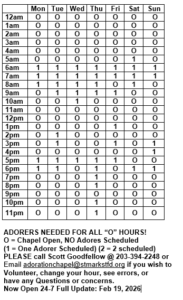 Please consider volunteering an hour of your time and becoming a regular adorer. You may also stop in any time you wish as your schedule allows, for any length of time.