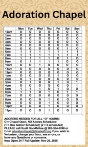 Please consider volunteering an hour of your time and becoming a regular adorer. You may also stop in any time you wish as your schedule allows, for any length of time.